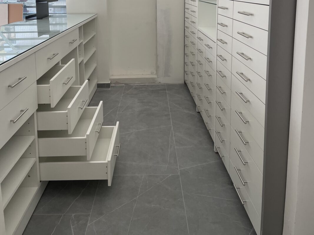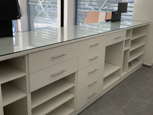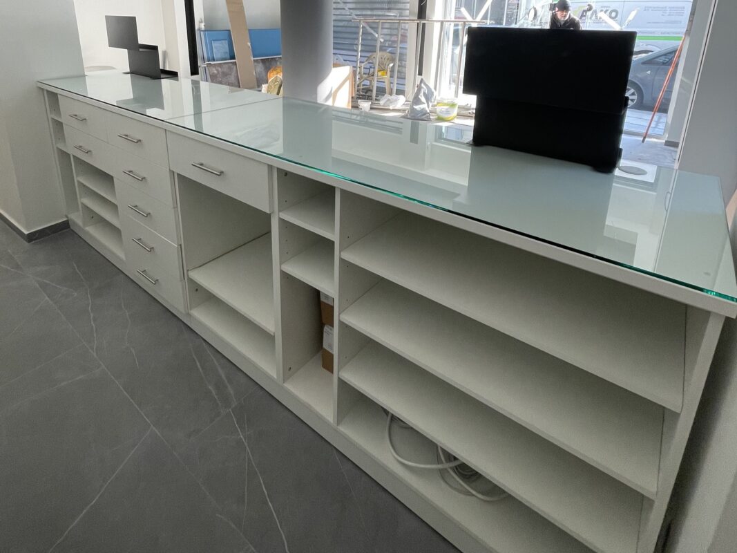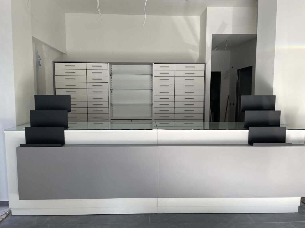 Πάγκος φαρμακείου/ έπιπλο υποδοχής/ reception με δύο θέσεις εργασίας κατασκευασμένος από μελαμίνη.