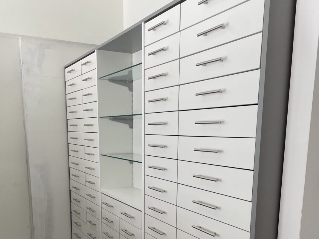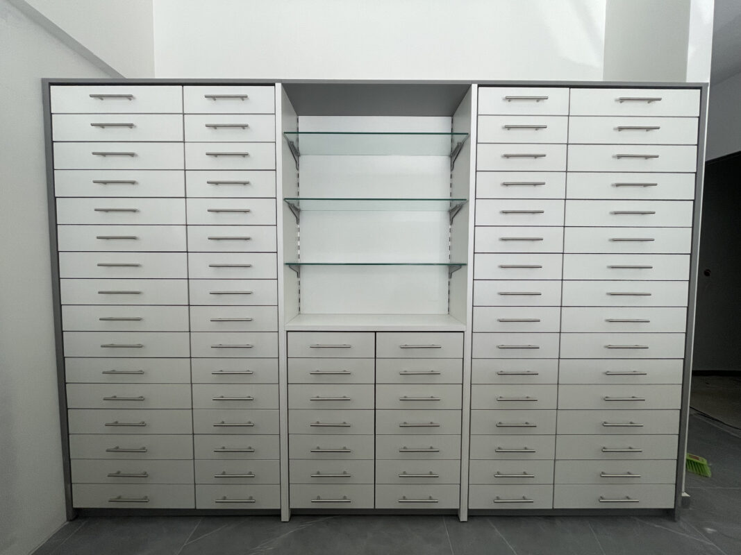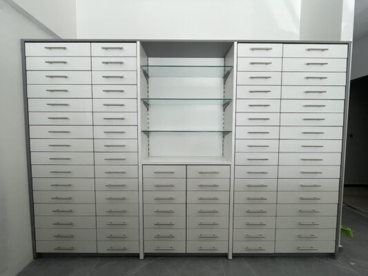 Εξάστηλη συρταριέρα φαρμακείου, της εταιρείας HUWIL.