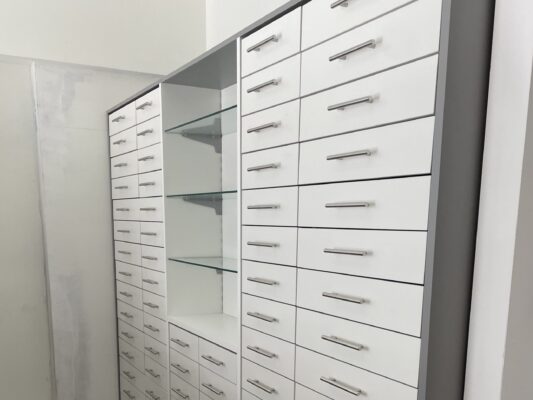 Η συρταριέρα μπορεί να συνοδευτεί από πλήθος αξεσουάρ. Συρτάρια για ομοιοπαθητικά, σκαλοπάτι, διαχωριστικά συρταριών από plexi glass, βαθιά και ρηχά συρτάρια φαρμάκων.