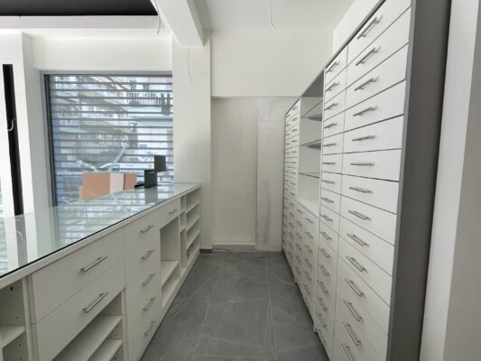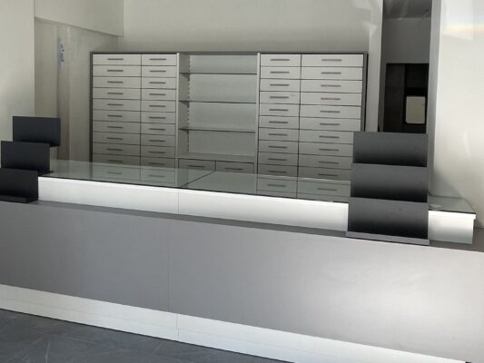 Kάθε στήλη της συρταριέρας αποτελείται από 12 ρηχά συρτάρια και 2 βαθιά στο κάτω μέρος της. Οι δύο μεσαίες στήλες είναι μόλις του ενός μέτρου δίνοντας μας την δυνατότητα να προσθέσουμε στο πάνω μέρος τους ράφια προβολής προϊόντων. Οι λαβές των συρταριών είναι ανοξείδωτες.